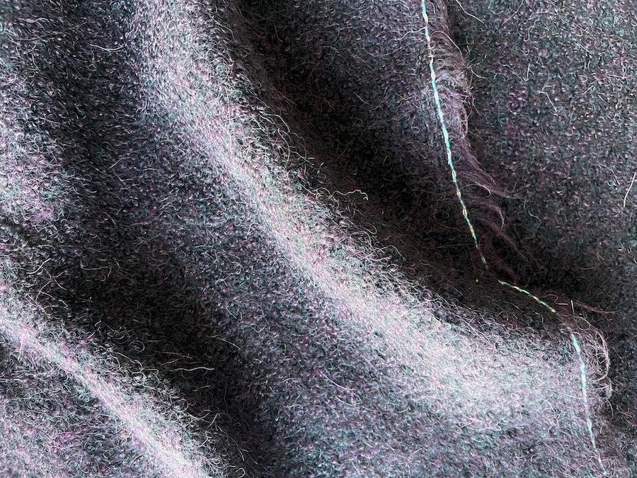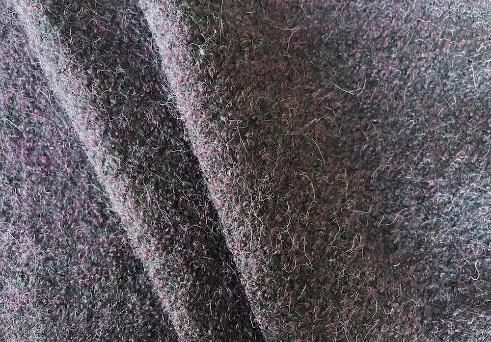 A distinctive wool blend bouclé coating in gorgeous, dark shades of Italian plum and chic black - this mid-weight coating is excellent for a fabulous coat, cape or wrap. Made in France. 28% wool, 28% alpaca, 24% mohair, and 20% nylon blend. 54" wide.