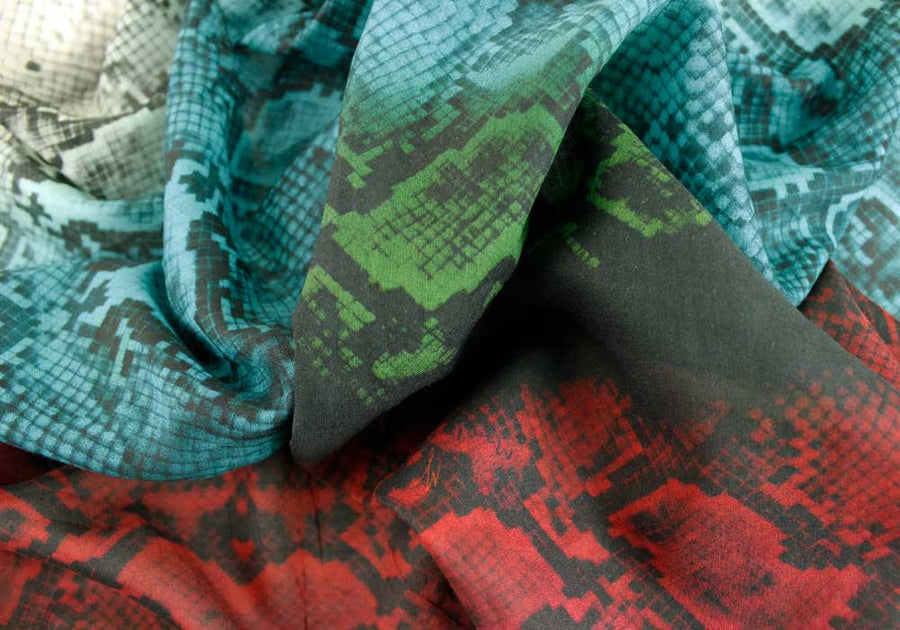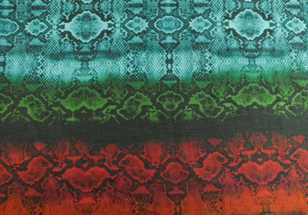 A lightweight cotton voile in a subtle snakeskin print in shades of yellow, orange, red, evergreen, turquoise, and white - the snaky stripes run crosswise - this semi-sheer print would make a lovely blouse, beach wrap, or full skirt. Made in Italy. 100% cotton. 59" wide.