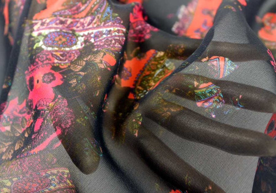 A drapey translucent silk chiffon with a gorgeous print of translucent floral and paisley motifs in beautiful jewel tones on a black background. Perfect for a chic lined blouse or a scarf. 100% silk. 54" wide.