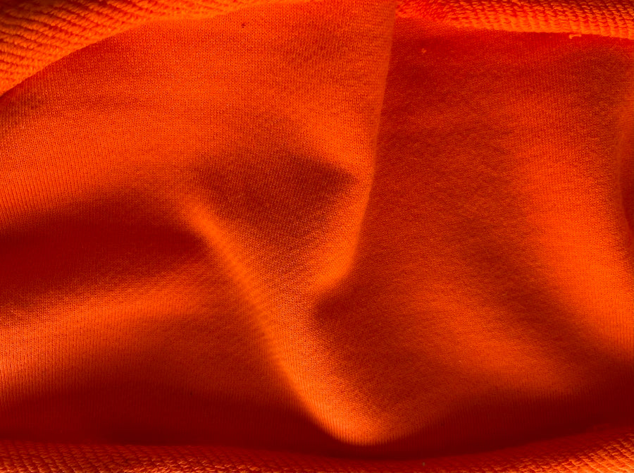 A French terry cotton sweatshirt knit in juicy clementine orange - this sweatshirting is the perfect weight for a comfortable dress, sweat pants, loungewear, or hoodies. Made in Italy. 100% cotton. Extra wide 68" wide.