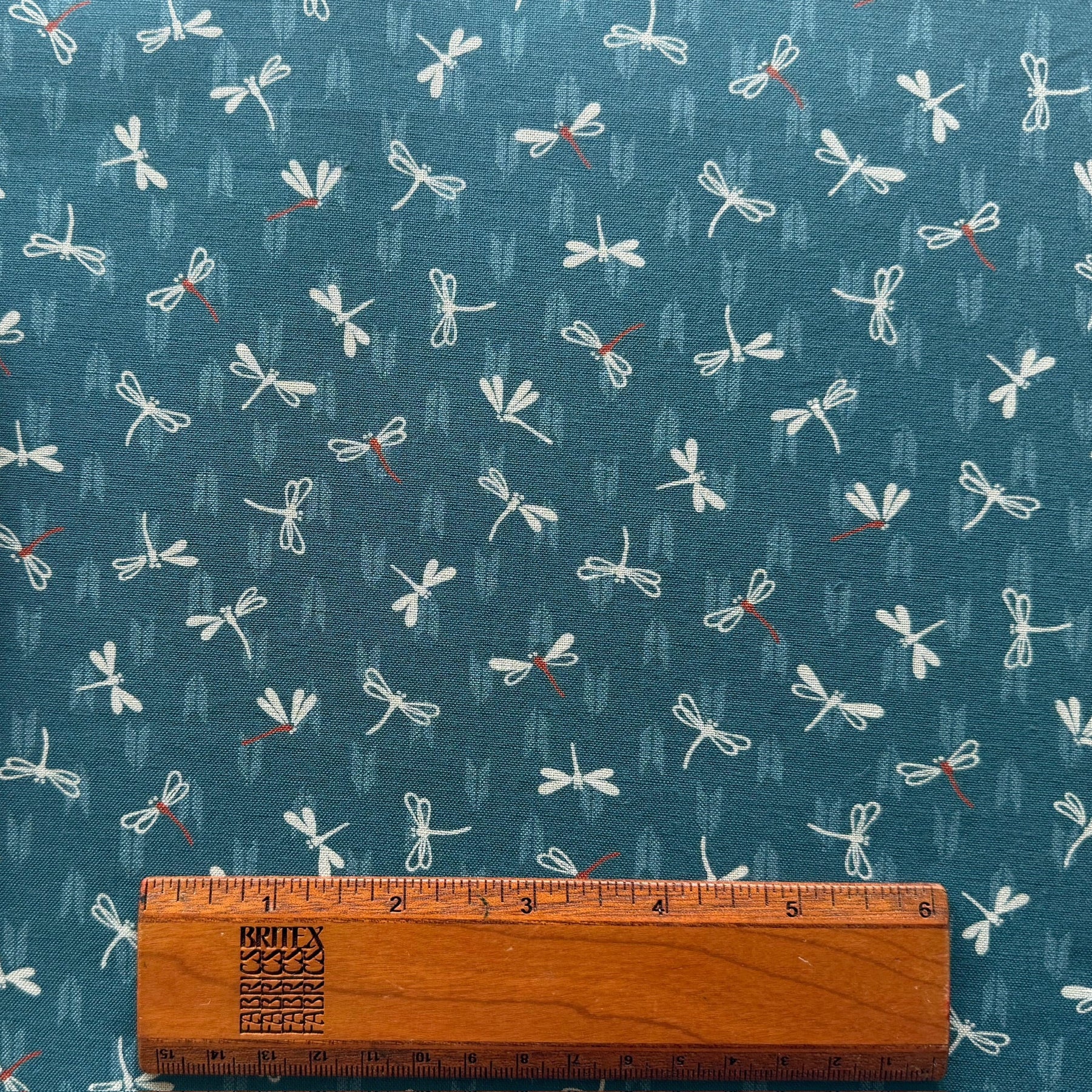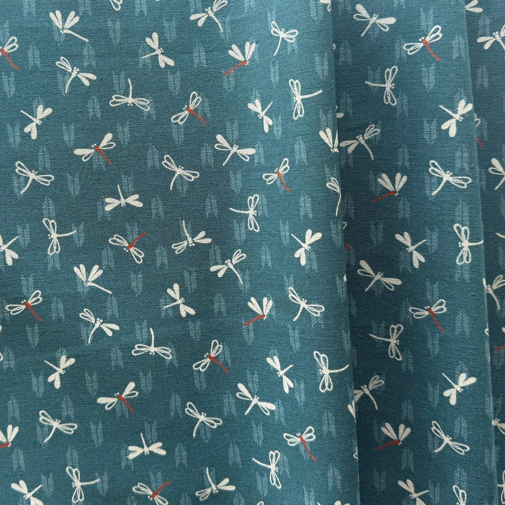 A quilting cotton with a print of Kasuri dragonflies and arrows on a muted Persian turquoise background - this graceful print is perfect for full skirts, blouses, totes, or aprons. Made in Japan. 100% cotton. 44" wide.