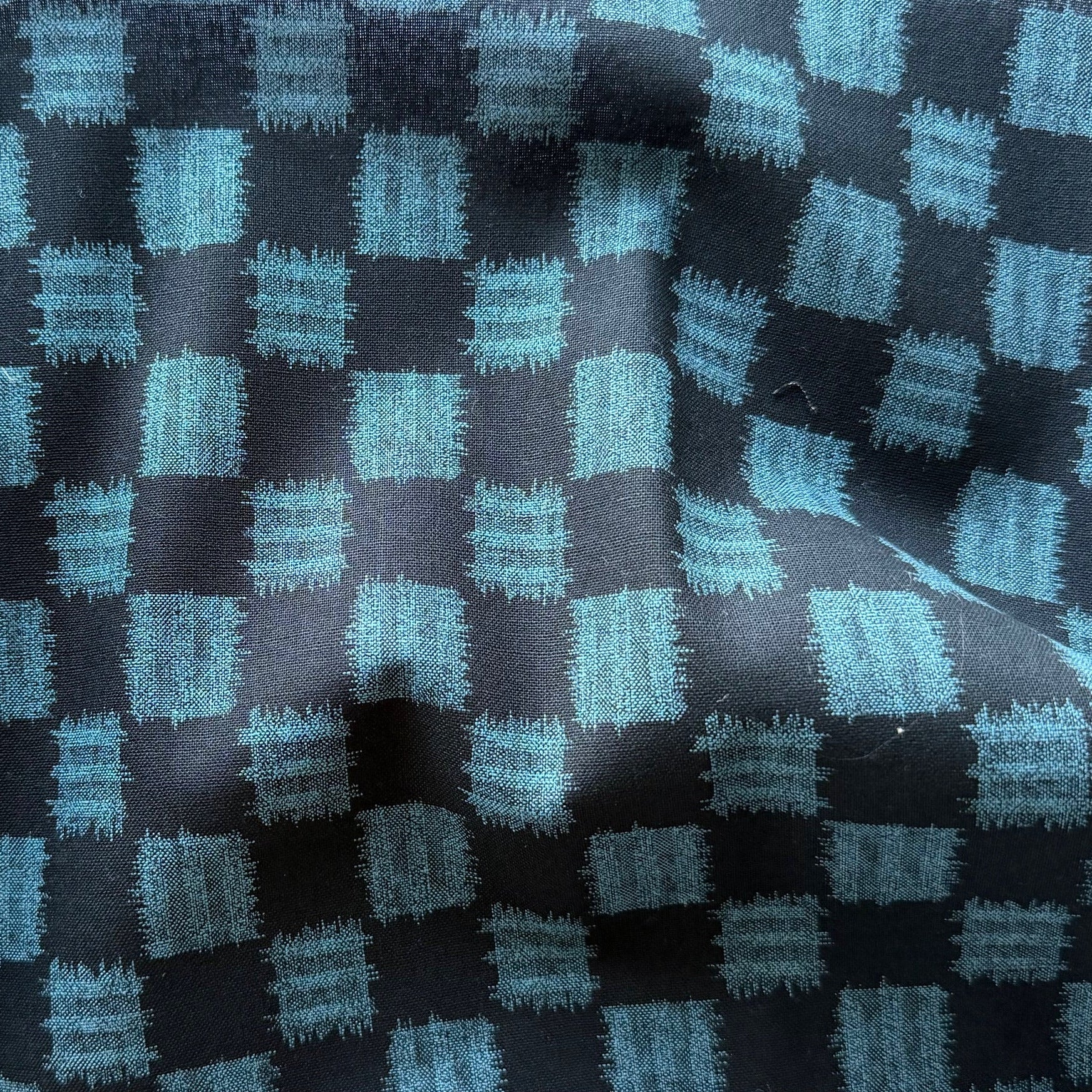 A quilting cotton with a kasuri print of slate blue ikat squares on a black background - this geometric print is perfect for full skirts, blouses, totes, or aprons. Made in Japan. 100% cotton. 44" wide.