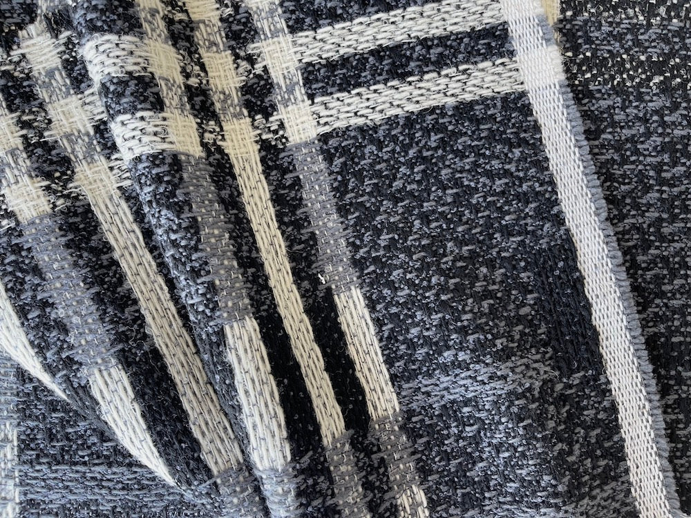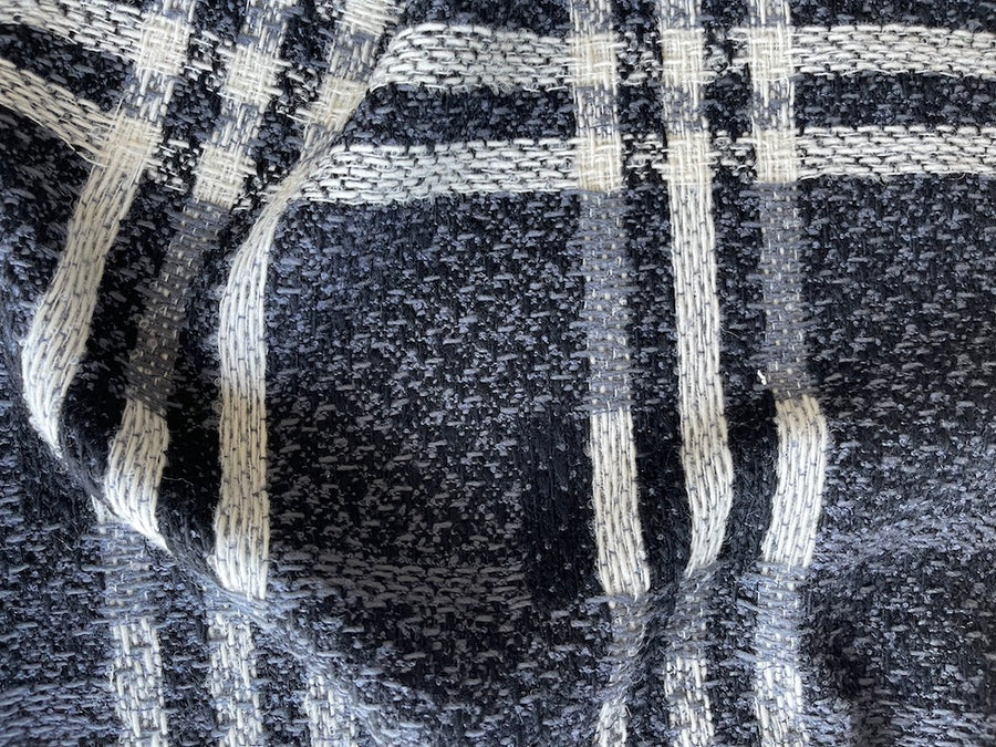 A dress-weight wool blend bouclé in a wonderful large-scale light ivory, whiskey gray, and black plaid - perfect for a terrific coat, a bed throw, or wide-legged pants. Made in Italy. Wool and polyester blend. 54" wide.
