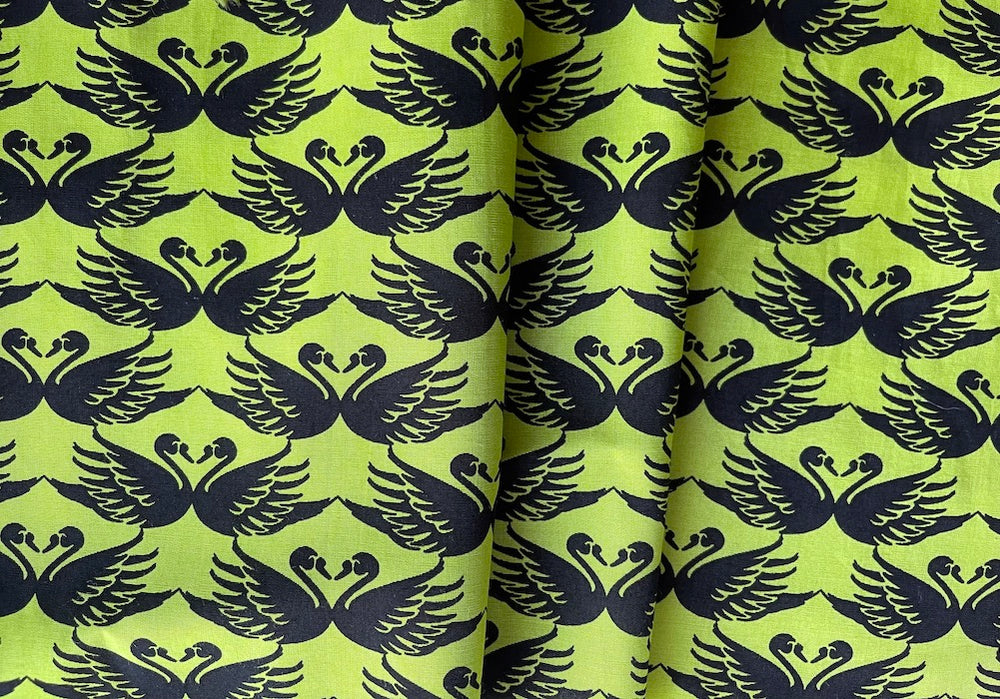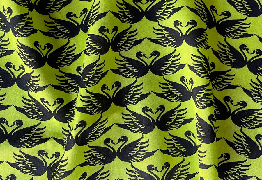 A lighter-weight viscose and cotton blend in a print of lovey black swans on a chartreuse background - this quirky cotton is perfect for a breezy cropped top, full palazzos, or a sundress. 50% cotton and 50% rayon viscose blend. 45" wide.