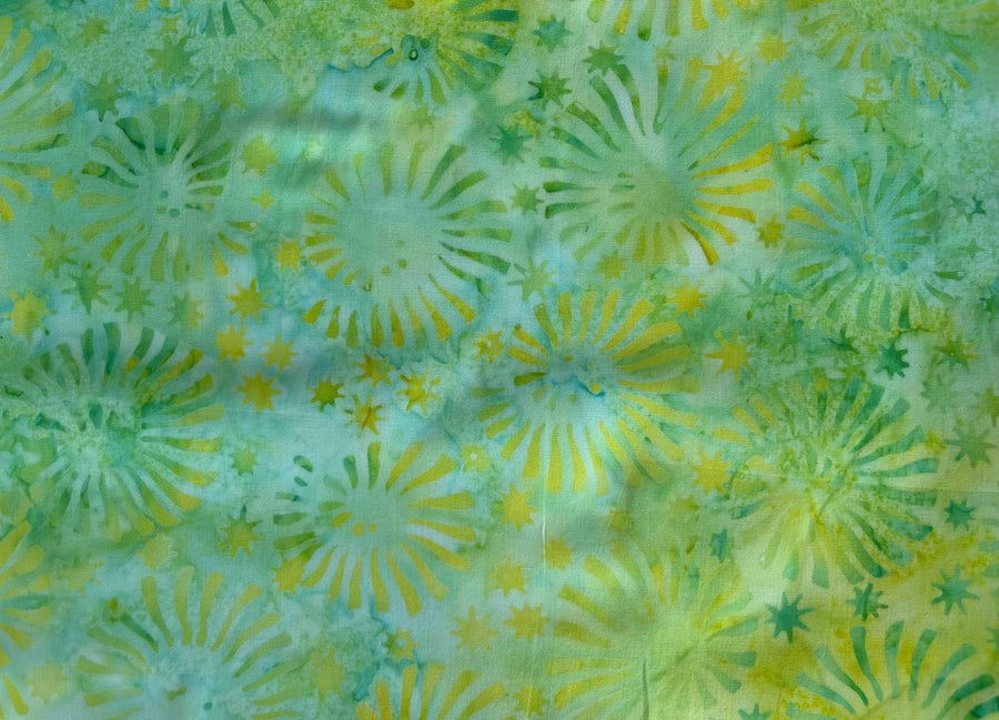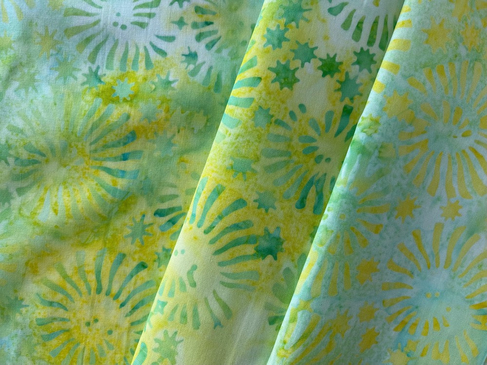 A tightly woven, soft cotton batik, with a poplin hand and in a print of lime and lemon colored fireworks.