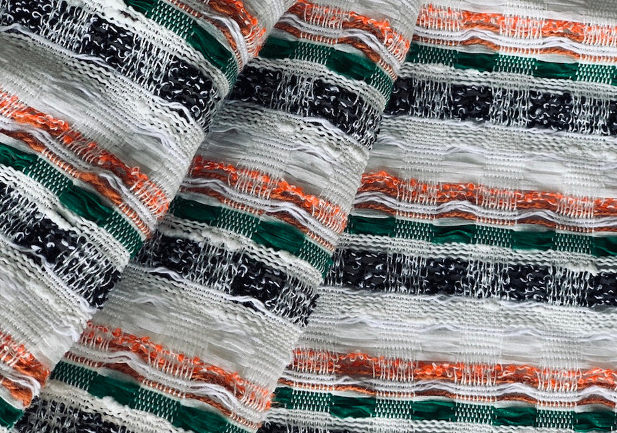 A loosely woven cotton blend stripe in shades of coral, malachite, black, and white - summery and light, this cotton blend is perfect for a poolside robe, a tunic, or a scarf. Made in France. 45% polyester, 22% poliamide, 18% cotton, 6% acetate, 4% viscose, 4% wool, and 1% acrylic. 50" wide.