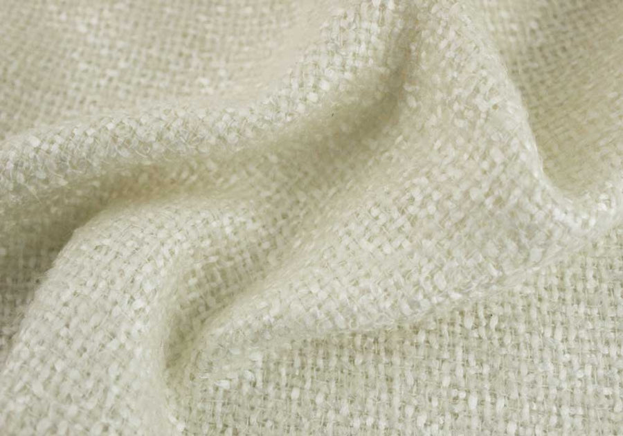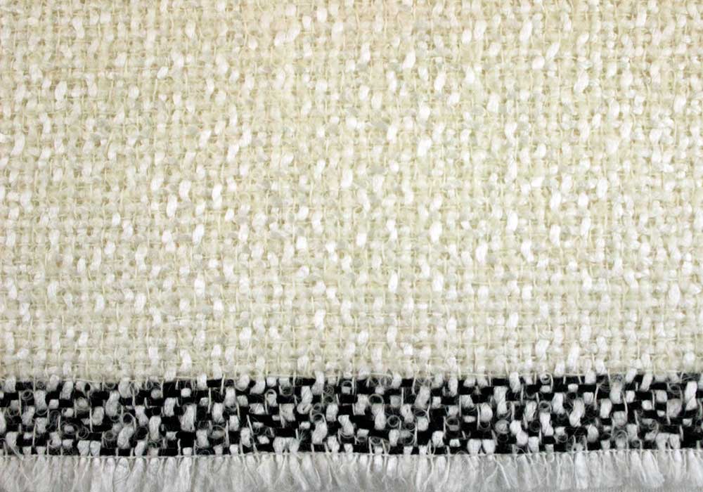 A luxurious mohair blend bouclé in a beautifully warm ivory vanilla, with a heavy drape and a soft hand. Each selvedge has a fashionable 3/4" wide black and vanilla border and a thick 3/8" vanilla fringe - perfect for a glamorous couture jacket or suit. Made in Spain. 66% acrylic, 24% mohair, 8% nylon, and 2% polyester. 60" wide.