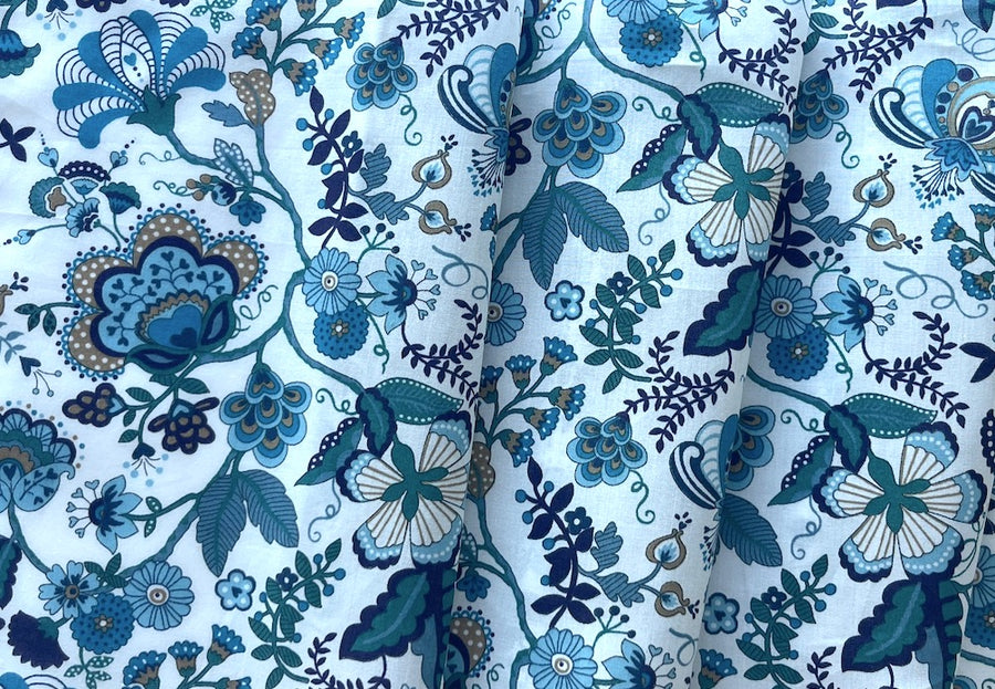 A luxuriously soft cotton lawn from the iconic English company, Liberty of London - Mabelle is inspired by Indian chintz designs of the 17th and 18th centuries., all in shades of teal blue, deep purple, aquamarine, turquoise, ocean blue, and bronze on a white background.