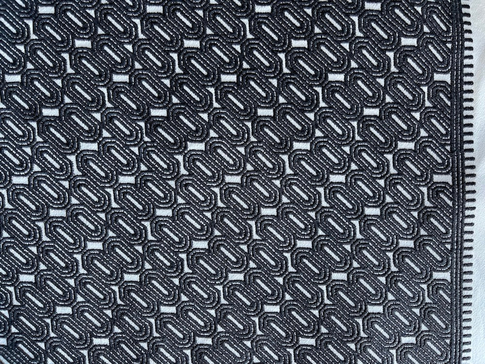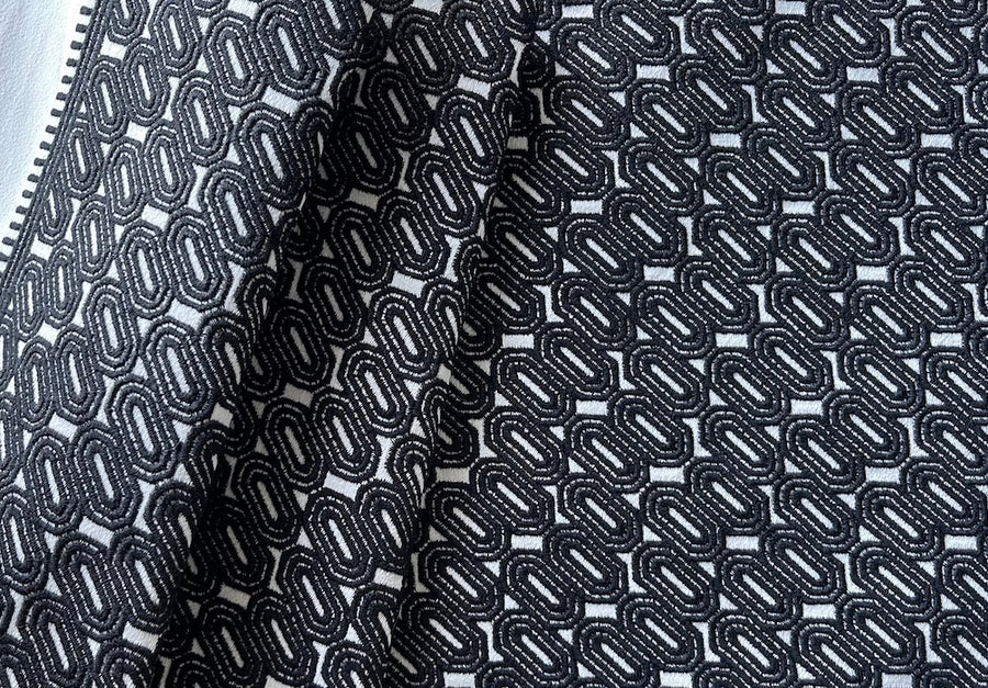 A magnificent couture viscose blend crepe with embroidered black hexagon shapes on white viscose crepe - this beautiful, heavy, and sophisticated fabric would make a magnificent evening cloak, elegant vest, or stunning skirt. Made in Italy and used by a high-end designer. Viscose base and cotton embroidery blend. 53" wide.