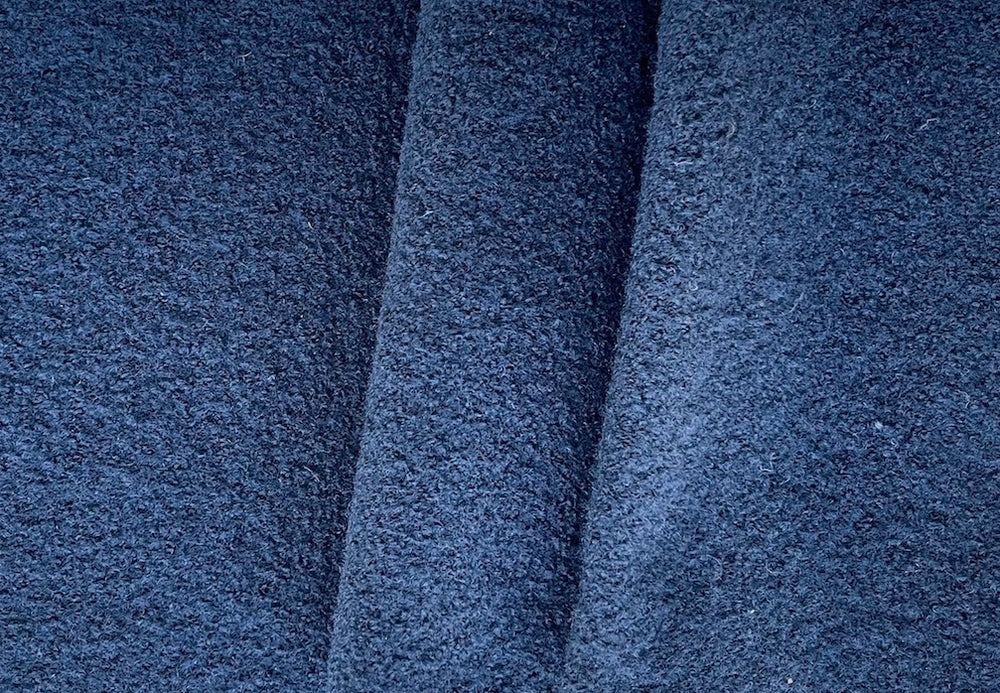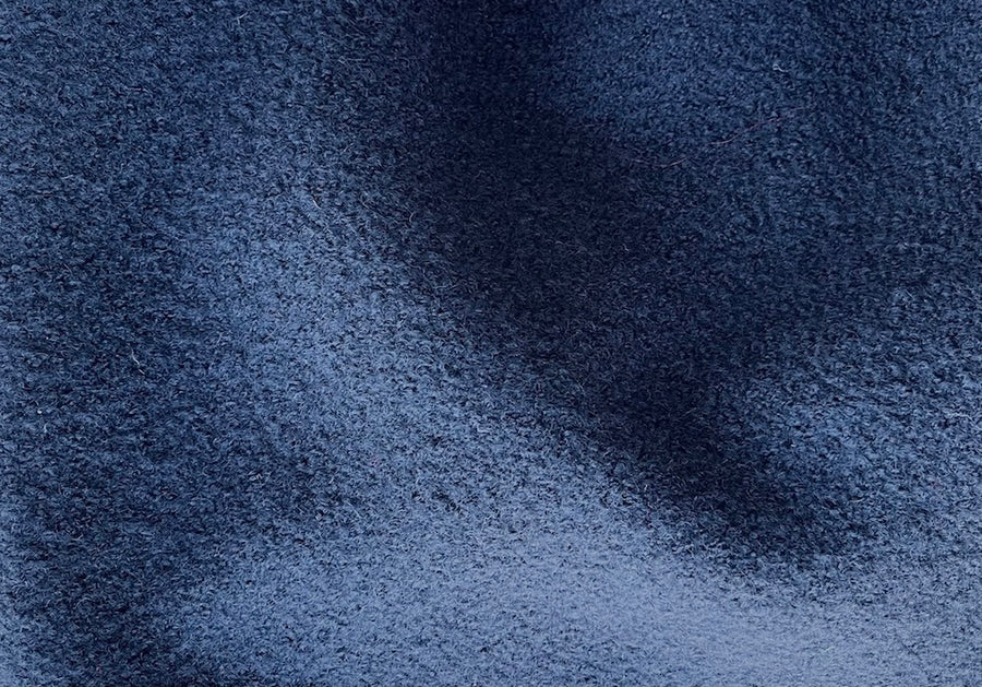 A boiled wool in classic navy blue. This lovely boiled wool is pliable, and would be an excellent for a toasty fall jacket, swingin' car coat, or a spiffy and toasty double-breasted vest. 100% wool. 50" wide.