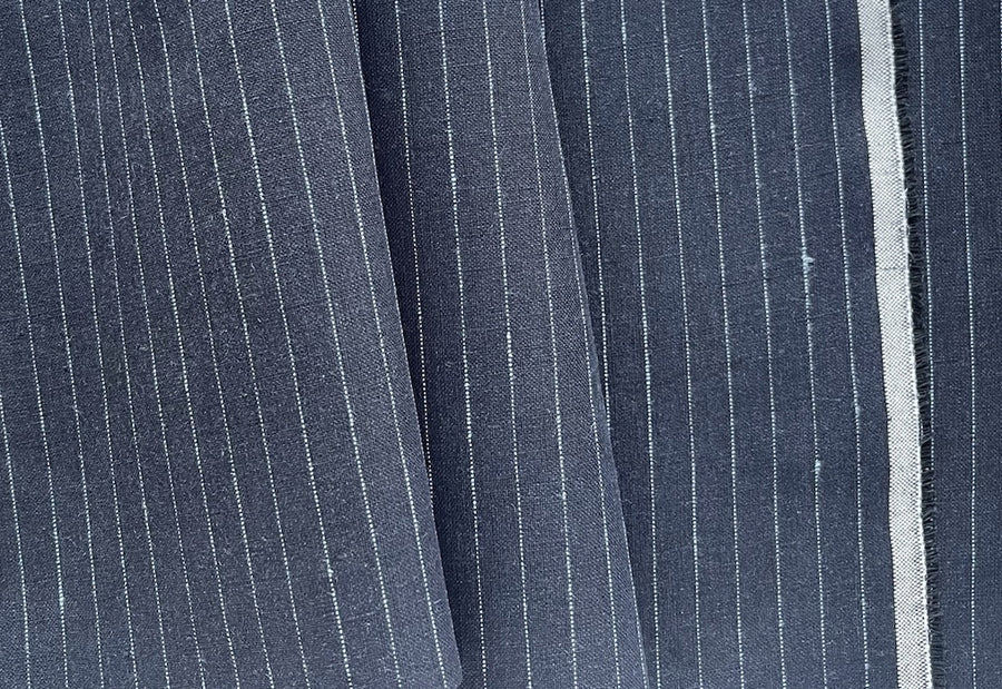 A mid-weight linen in a handsome baby blue lengthwise pinstripe on black - this dapper linen is perfect for menswear, slacks, skirts, jackets, and airy summer wear. Made in Poland. 100% linen. 55" wide.
