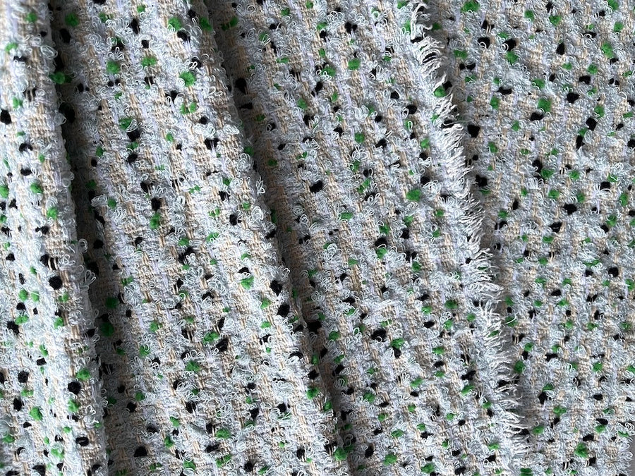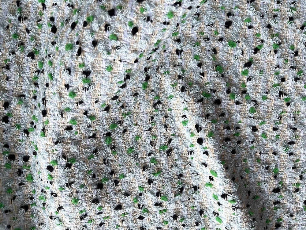 A mid-weight viscose blend bouclé in an ivory and cream ground accented with emerald green, baby blue, and black knots - this moderne, smart suiting would make a fabulous French couture-style jacket, sleeveless sheath dress, or a warm weather suit. Made in Italy and used by a high-end New York manufacturer. 50% rayon viscose, 31% cotton, 15% poliamide, and 4% polyester, blend. 59" wide.