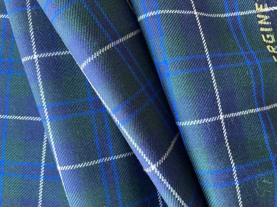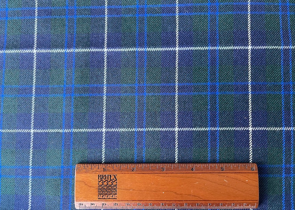 A high-end, selvedged wool twill in a classic midnight navy, cobalt, hunter green, and white tartan plaid - this tightly-woven twill is perfect for skirts, pants, jackets, capes...and of course, kilts. Made in Italy. 100% wool. 60" wide.