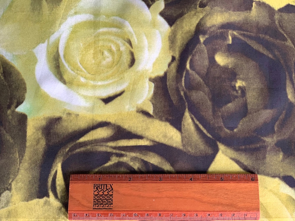 A smooth, lightweight cotton lawn, a digital print of lush overblown roses in shades of pale green, olive, and celadon, on a black background - marvelous for a summer frock or skirt. Made in Italy for Moschino. 100% cotton. 54" wide.