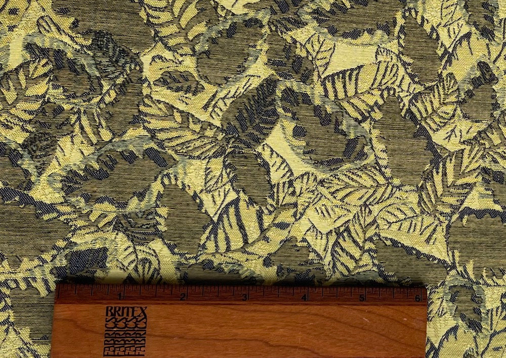 A cotton blend brocade suiting in a sophisticated naturalistic print in deep olive on a banana background - this soft suiting is perfect for an elegant sheath dress, a summer jacket, or a wrap. Made in France. Cotton and polyester blend. 60" wide.