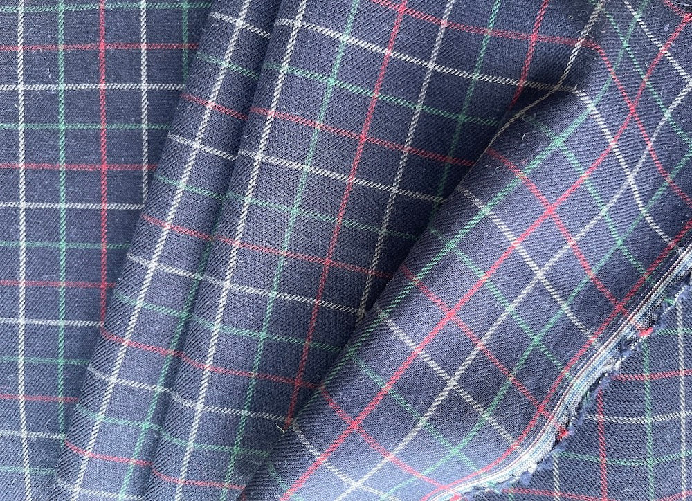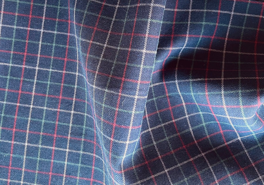 A light to mid-weight, soft cotton flannel tattersall plaid in shades of pine, red, and white on a navy blue background - this flannel is perfect for warm shirts and cozy loungewear. 100% cotton. 56" wide.