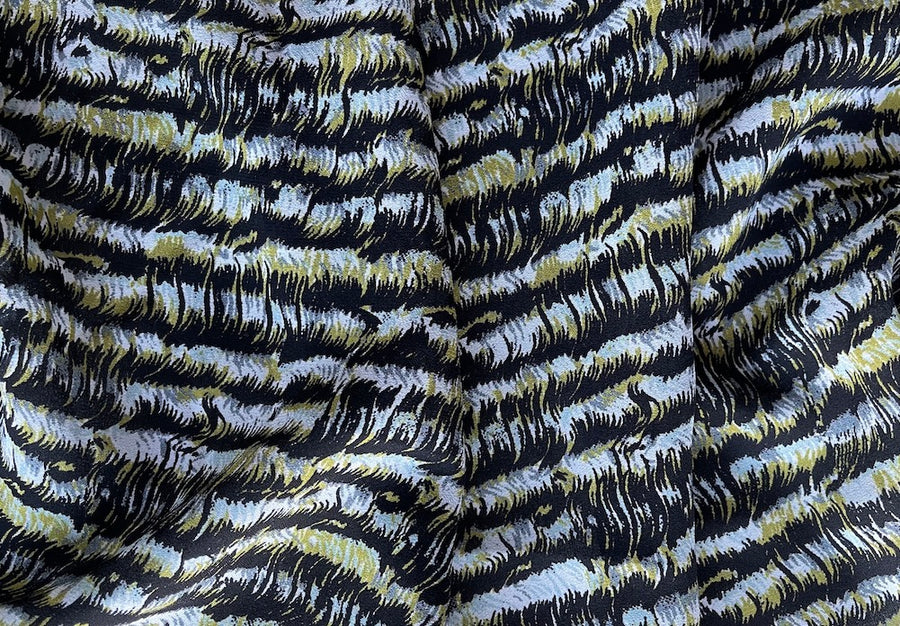 A delightful silk crepe in print of variegated, feathery stripes in ochre, pearl gray, white, and black - light and drapey, this is perfect for a blouse, tunic, or palazzo pants. Made in Italy. 100% silk. 54" wide.
