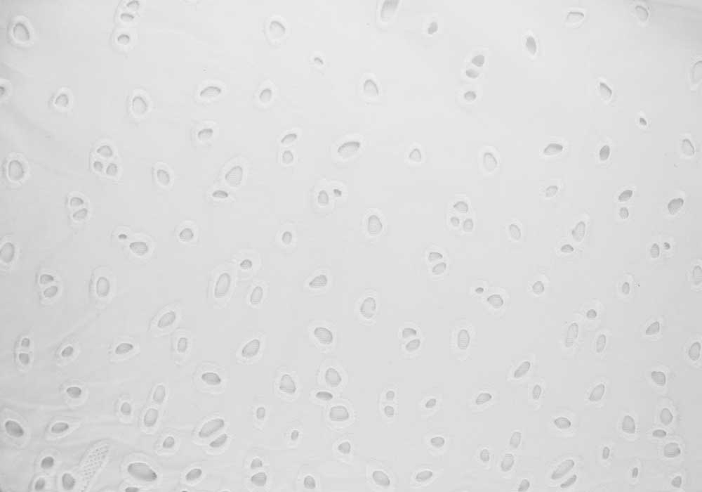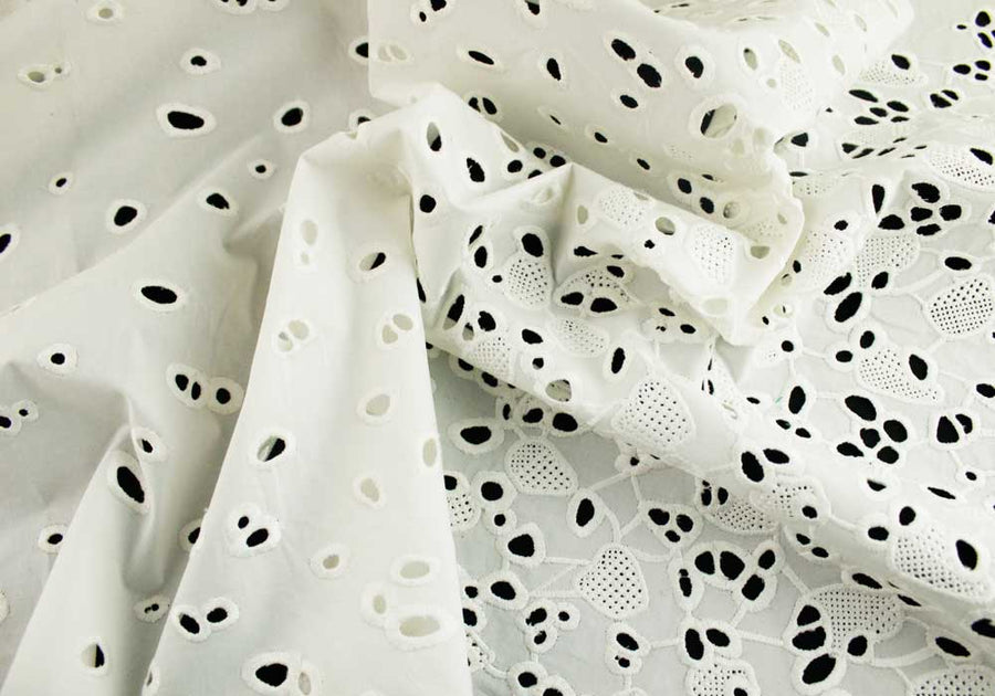 An off-white embroidered cotton eyelet with delicate design of falling petals. The ombré flurry of eyelets start at 19" from one selvedge until they reach the opposite selvedge, where they form a dense blanket of eyelets - perfect for a shirtwaist dress or a full skirt. Fabric images include fabric with no background, along with fabric with a black background for clarity. Cotton base with rayon embroidery. 57" wide.
