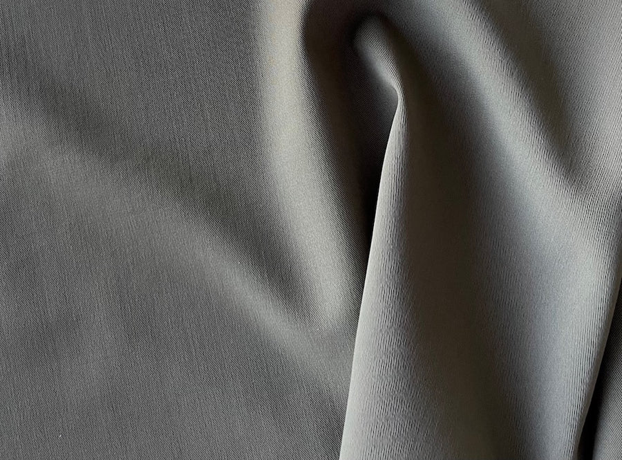 A mid-weight stretch wool twill gabardine in olived mushroom - with a touch of lycra, this easy going woolen is perfect for slacks, tailored dresses, or a chic pantsuit. 93%  wool and 7% lycra. 60" wide.