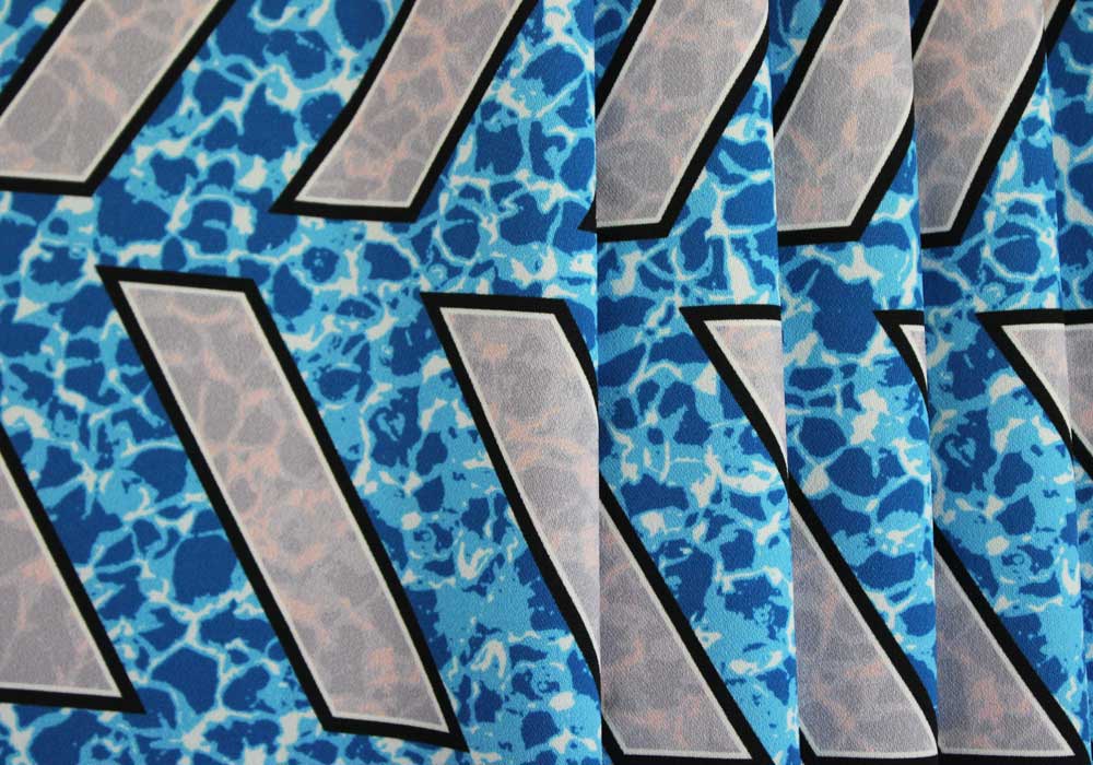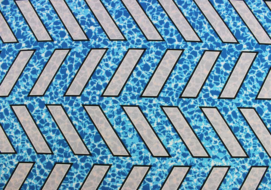 A midweight polyester fabric with an abstract print of crosswise parallelograms on a mottled background in shades of blue - perfect for a dress or skirt. Designed by American designers at Opening Ceremony. Slight one-way stretch. 100% polyester. 55" wide.