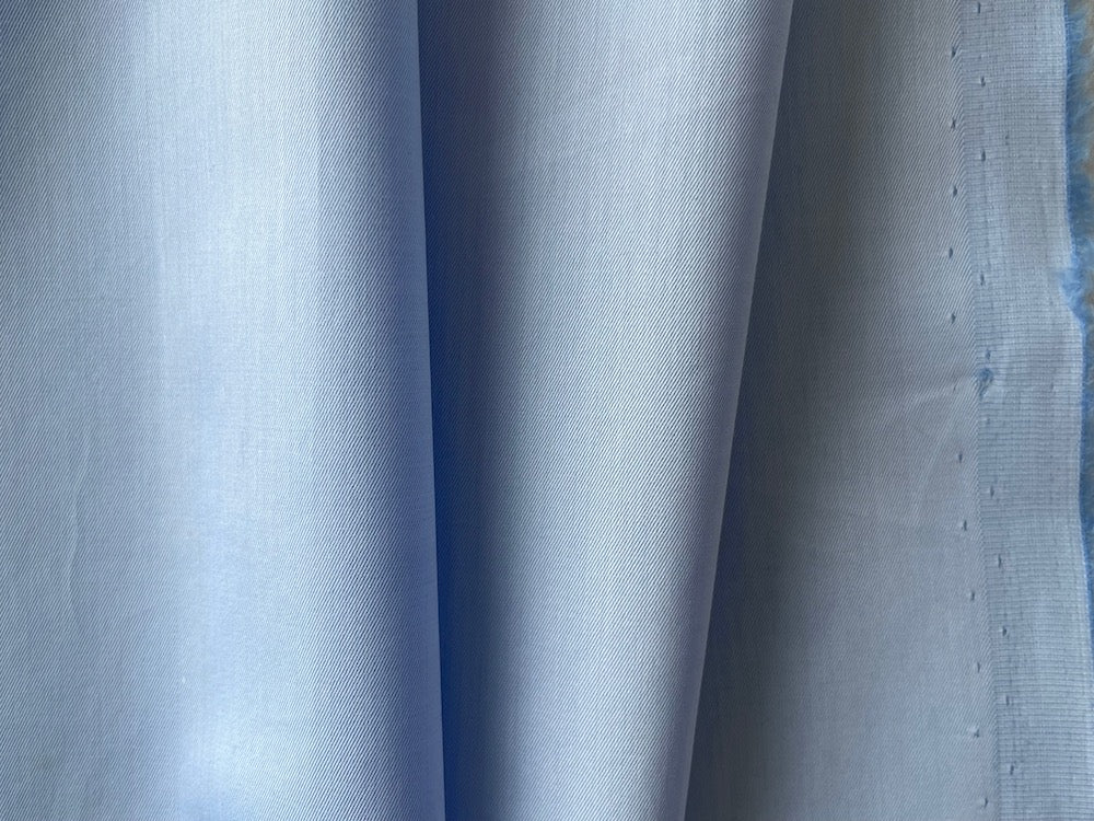 The finest 2-ply cotton sateen micro-twill shirting in light blizzard blue - luxurious and tightly woven, this twill shirting is perfect for bespoke shirts, bed linens, or blouses. Made in Italy. 100% cotton. 59" wide.