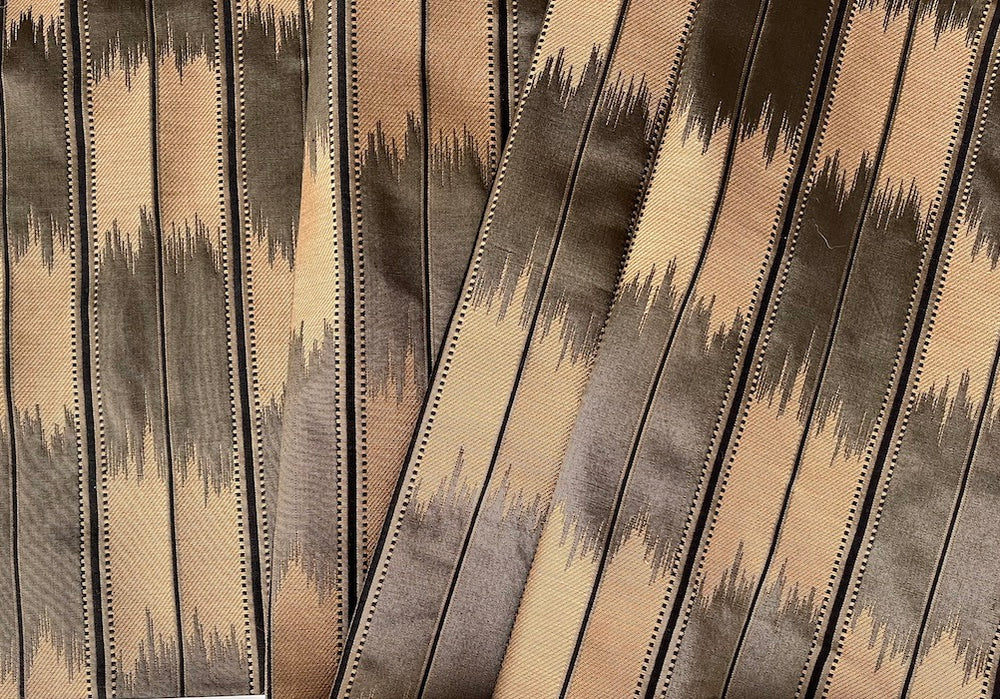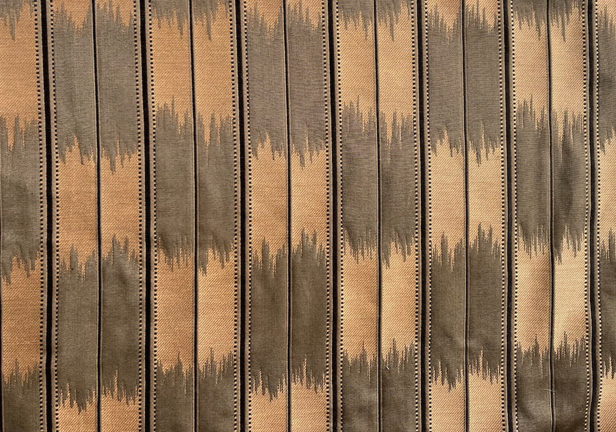A mid-weight silk blend brocade in a lengthwise striped ikat design in shades of peachy café au lait, muted olive, and black - this smart fabric is perfect for Roman shades, duvet covers, chair upholstery, or even a tailored jacket. Made in India. 75% silk and 25% cotton blend. 56" wide.