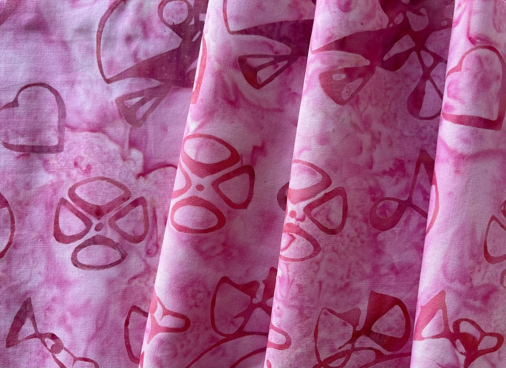 A tightly woven, soft cotton batik, with a poplin hand and in a print of hearts and flowers in shades of peppermint and raspberry pink.