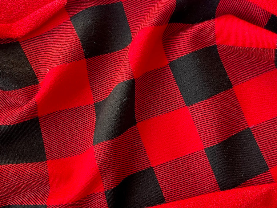 A soft rayon viscose French terry knit in vivid red and black buffalo checks - with hint of Lycra, this is perfect for a long wrap dress, leggings, or hoodies. Smooth, cold water wash. Made in Italy. Rayon viscose and lycra blend. 68" wide.