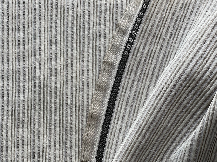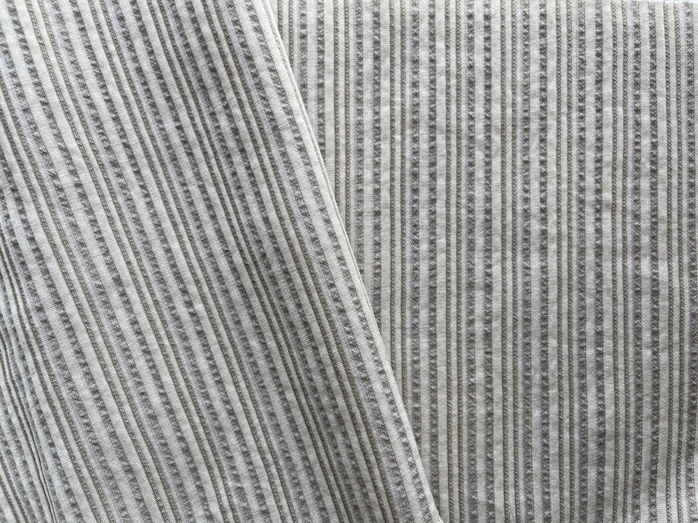 A puckered wool and cotton blend in greyed out taupe and off-white lengthwise stripes - this handsome suiting is perfect for showcasing its stripes! Make a finger-tip length jacket with diagonal trim, or pants with contrasting cuffs. Made in Italy. Wool and cotton blend. 61" wide.
