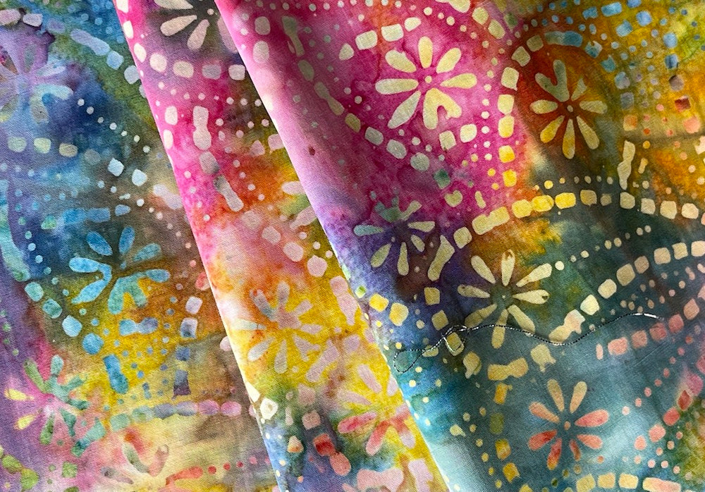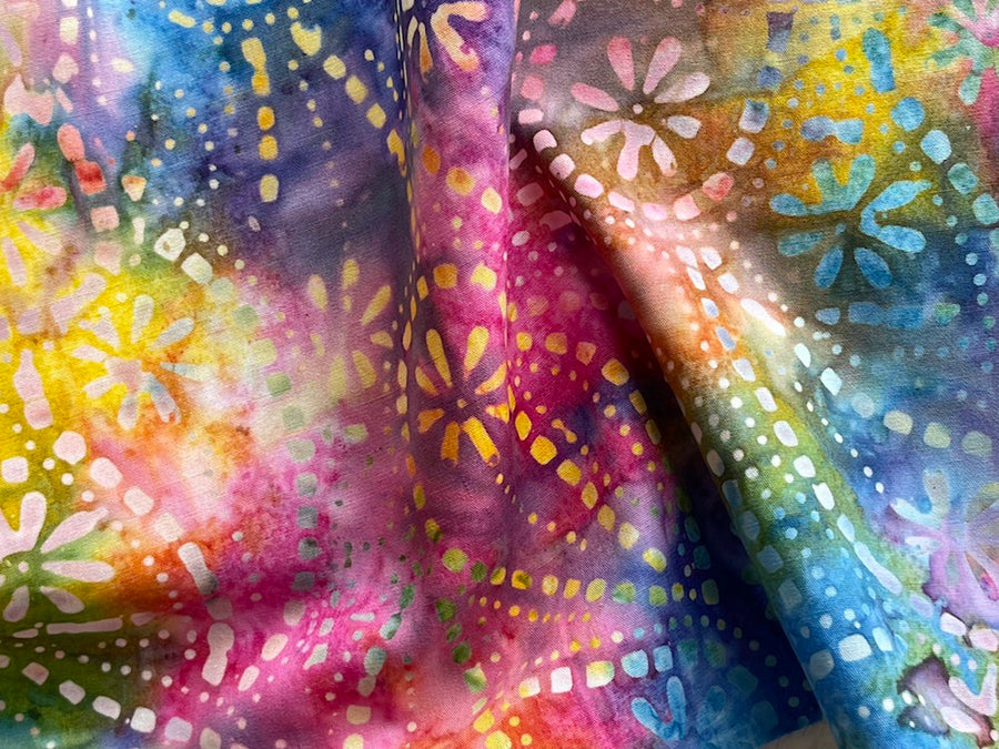 A tightly woven, soft cotton batik, with a poplin hand and in a joyous floral and paisley pattern in rainbow shades of lilac, fuchsia, royal, yellow, mango, and pine. Batik is an ancient wax resist fabric dyeing technique, often resulting in colors with uniquely shaded effects. This batik washes beautifully and is perfect for quilting, garments, table linens, and home decor -- great for a cabana shirt, a sundress, or a pool wrap! Made in Indonesia. 100% cotton. 45" wide.