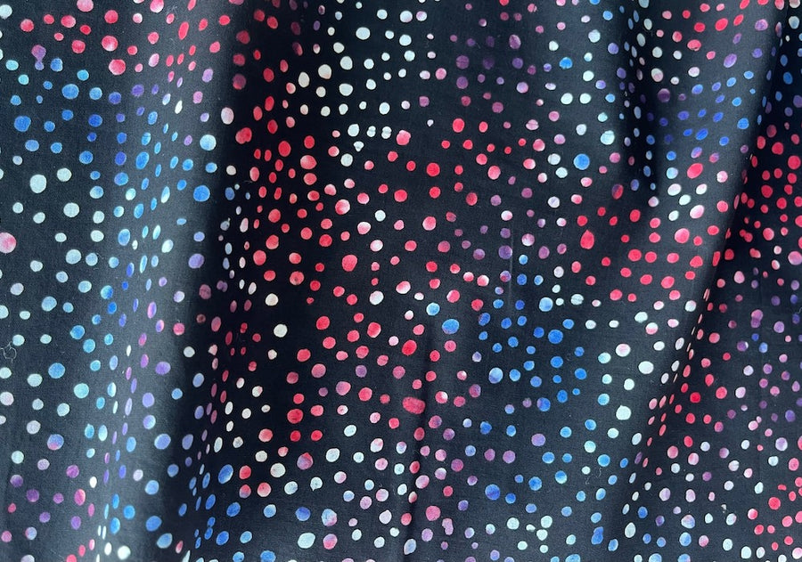 A tightly woven, soft cotton batik, with a poplin hand and in a red, white, and blue dotted print on a midnight black background.