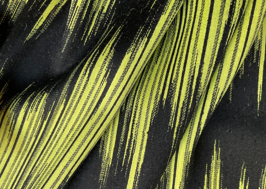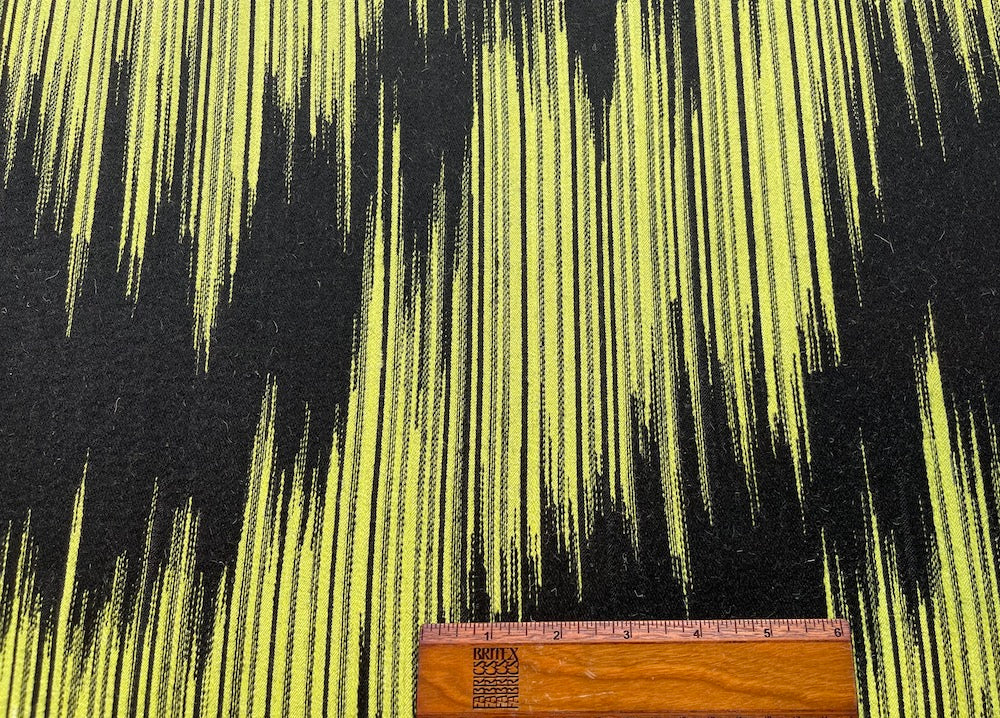 A reversible wool melton coating in a dramatic design of bright lemon stalactites on a black background - this handsome melton is perfect for an elegant overcoat, a hooded jacket, or stunning sofa pillows. Made in Italy. 60% wool, 30% nylon, and 10% polyester blend. 60" wide.