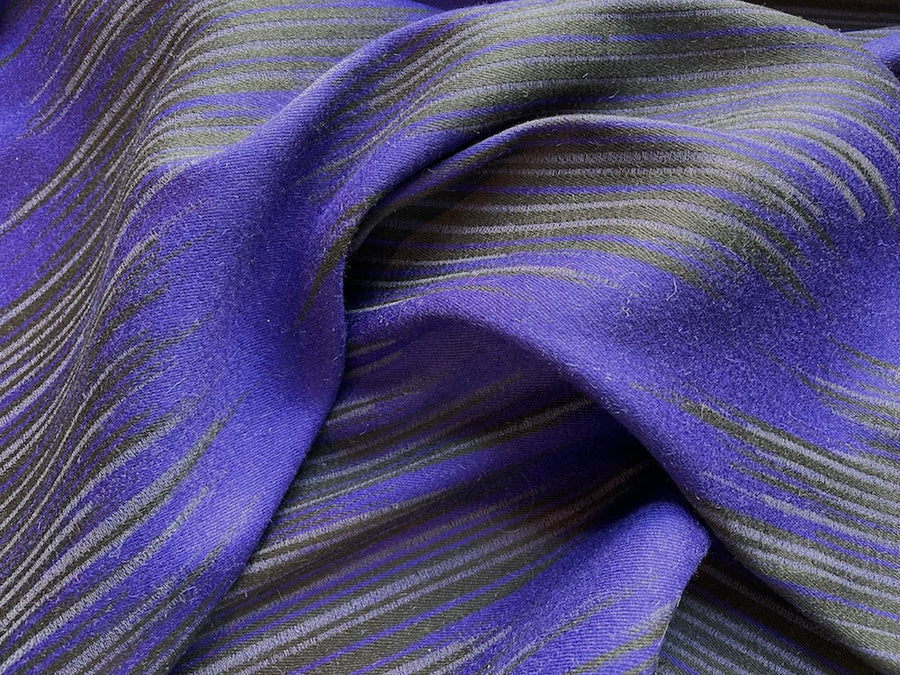 A reversible wool melton coating in a dramatic design of royal purple stalactites on a soft black background - this handsome melton is perfect for an elegant overcoat, a hooded jacket, or stunning sofa pillows. Made in Italy. 60% wool, 30% nylon, and 10% polyester blend. 60" wide.