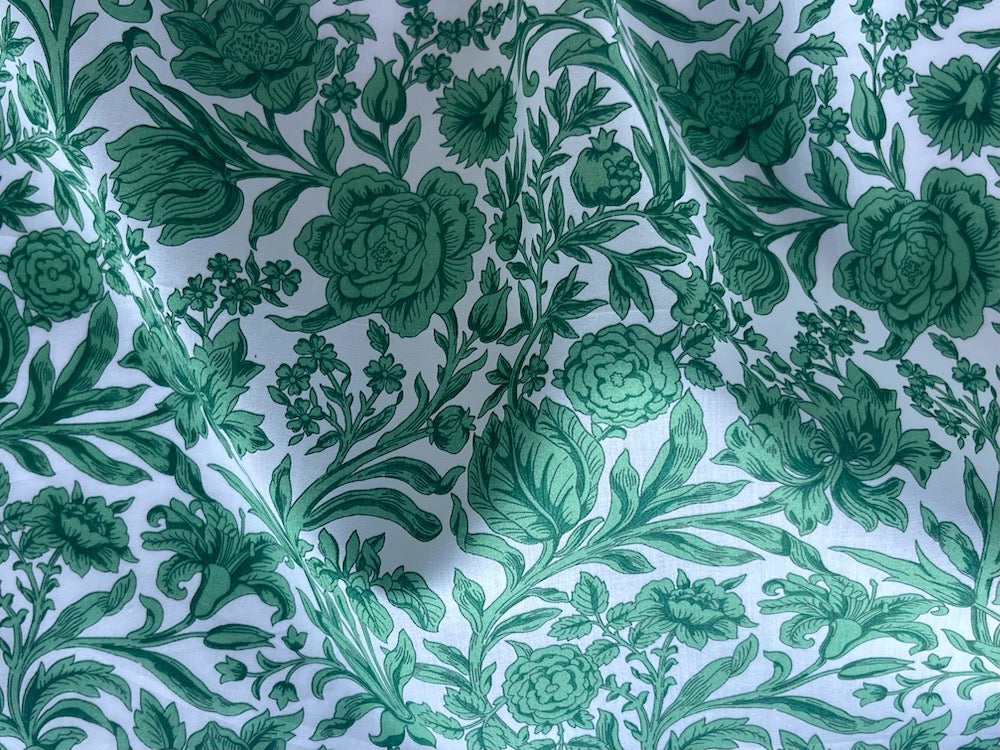 A luxuriously soft cotton lawn from the iconic English company, Liberty of London - Sambourne was originally created in 1977, and is an ornamental monochrome floral print with roses, lilies, pinks, tulips, and pomegranates hiding amongst its trailing foliage. This colorway is in shades of emerald green on a white background.