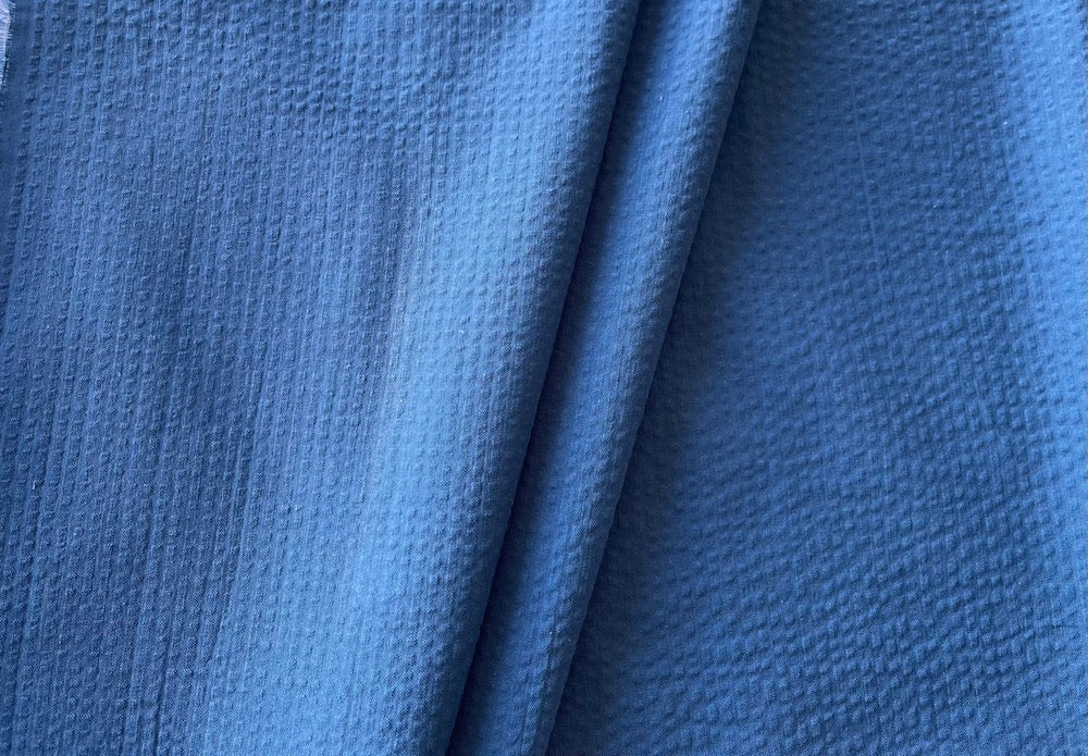 A cotton seersucker in saturated lupin blue - this soft cotton is perfect for summer blouses, a classic board shirt, a full skirt, or a cool nightgown. Made in Japan. 100% cotton. 44" wide.