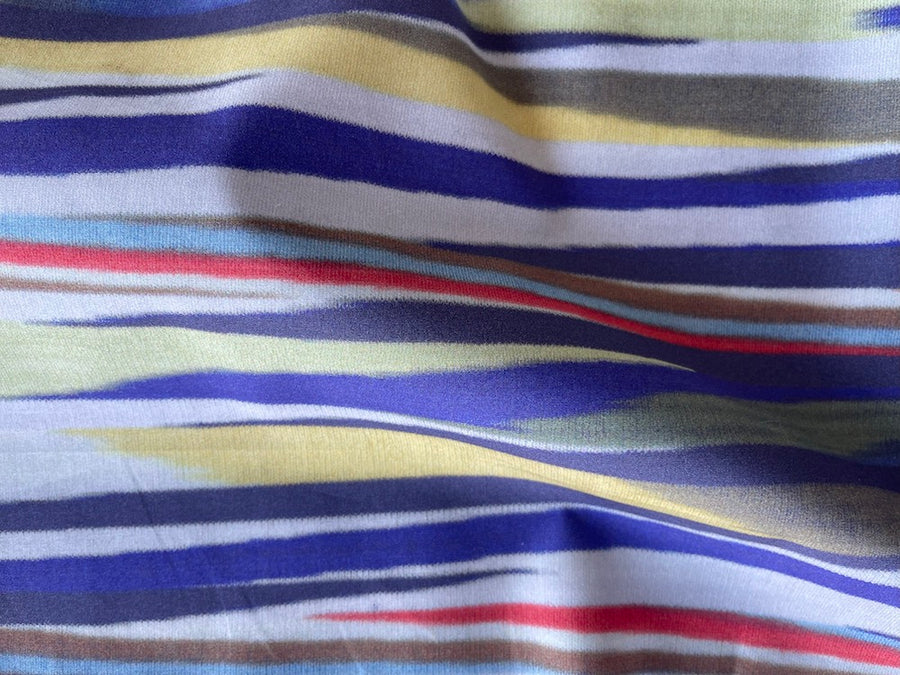 A soft cotton poplin in an irregularly striped print in summertime shades of butter yellow, light red, purple, sky blue, and ivory - wonderful for a skirt or a long tunic. Made in Italy. 100% cotton. 60" wide.