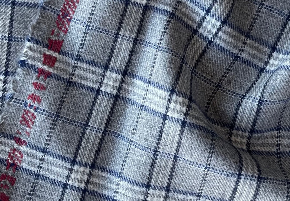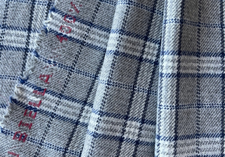 The finest, selvedged cashmere coating in a handsome heather grey, bright navy, and winter white plaid - this plush, mid-weight coating is perfect for a fabulous coat, cape, cozy sofa throw, or jacket. Made in Biella, Italy at a fine Italian house. 100% cashmere. 62" wide.