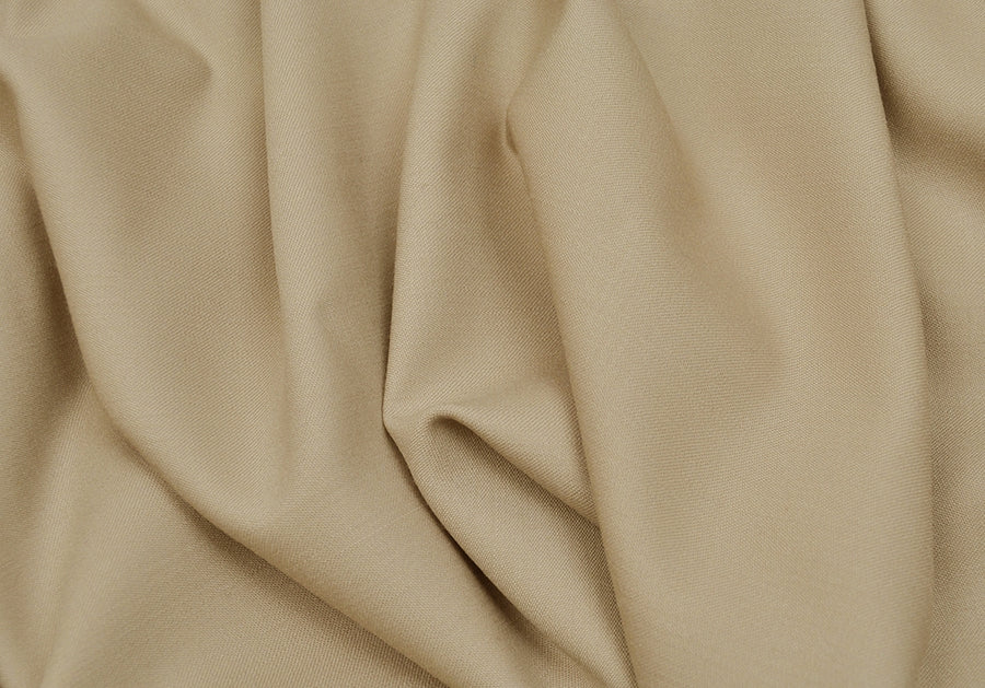 A beautiful midweight stretch wool twill in tan, with a woven selvedge and a touch of lycra - pliable and drapey. This fine Italian wool is perfect for slacks or an outstanding suit. Made in Italy. 100% wool. 58" wide.