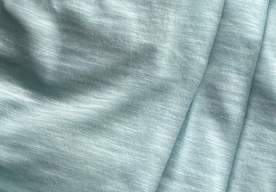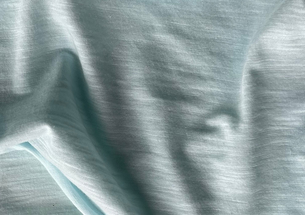 A high-end, semi-sheer cotton jersey knit with a slubby texture and in soft pale aqua blue - a perfect weight for layering....make a nightgown or a T-shirt! Made in Japan. 100% cotton. 50" wide.