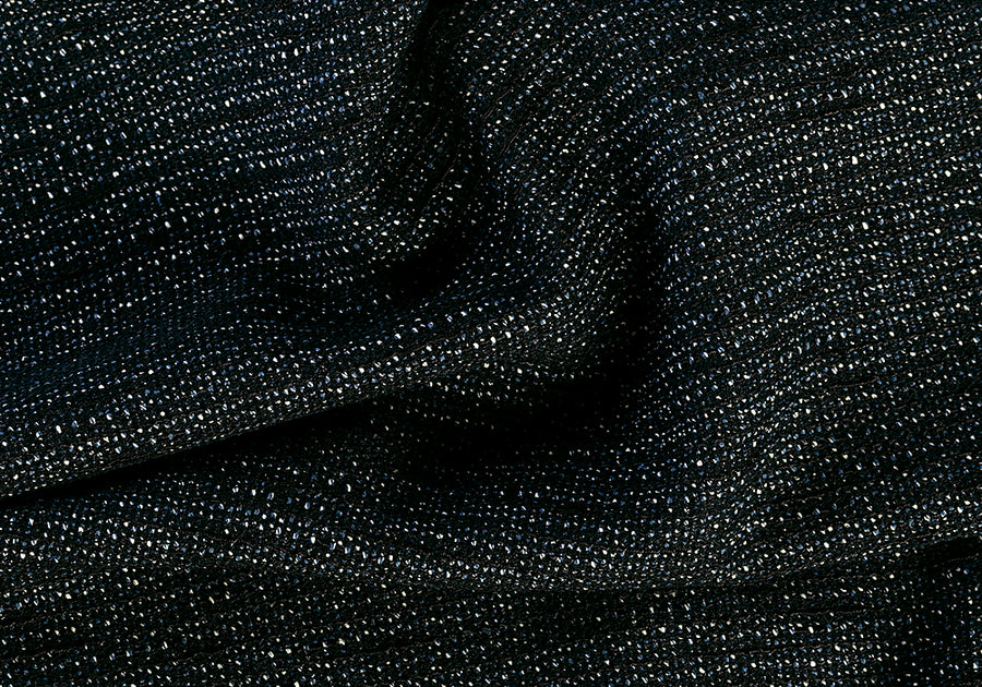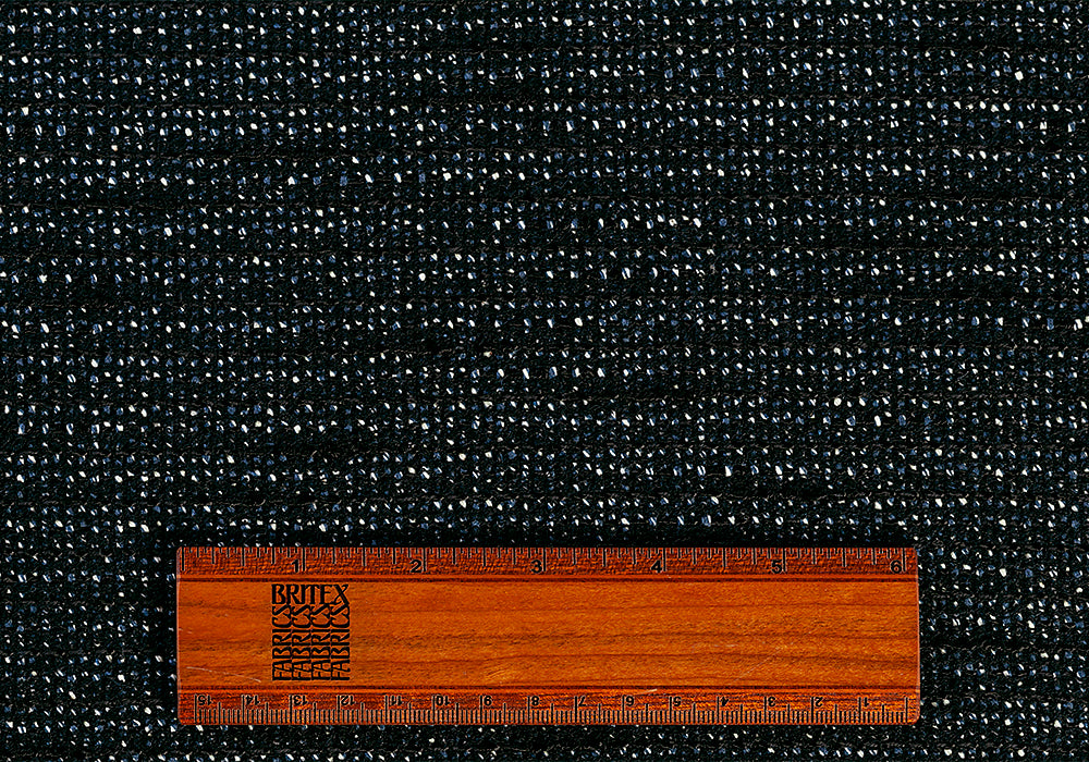 A textured 'n tweedy cotton blend in black with slate blue-grey and winter white accents - perfect for a French, high-end, couture-style jacket. Made in Italy. 90% cotton and 10% poliamide blend. 59" Wide.