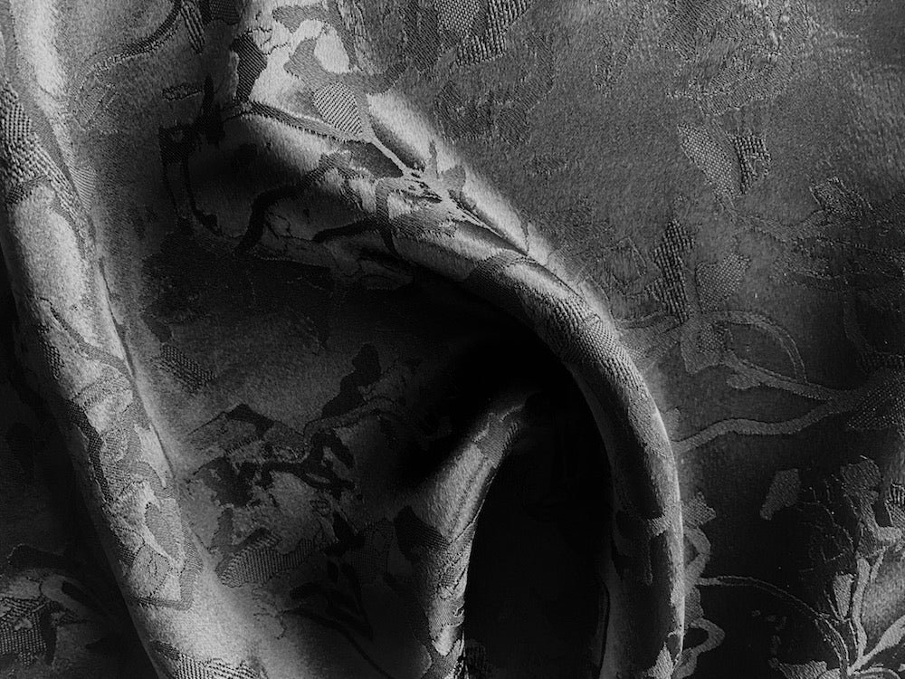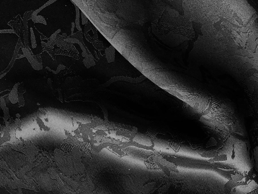 A luxurious viscose blend crepe-back satin jacquard in jet black - this slinky and sensual fabric is ideal for palazzo pants, a long skirt, or a simple tunic. Viscose acetate crepe should only be dry cleaned. Made in Italy. 54% acetate and 46% viscose blend. 51" wide.