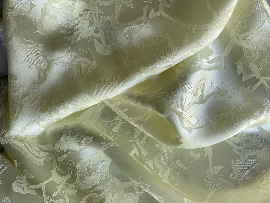 A luxurious viscose blend crepe-back satin jacquard in iced lemon - this reversible, sensual fabric is ideal for a perfect dress, a dainty bowed blouse, or a slinky robe. Viscose acetate crepe should only be dry cleaned. Made in Italy. 54% acetate and 46% viscose blend. 51" wide.