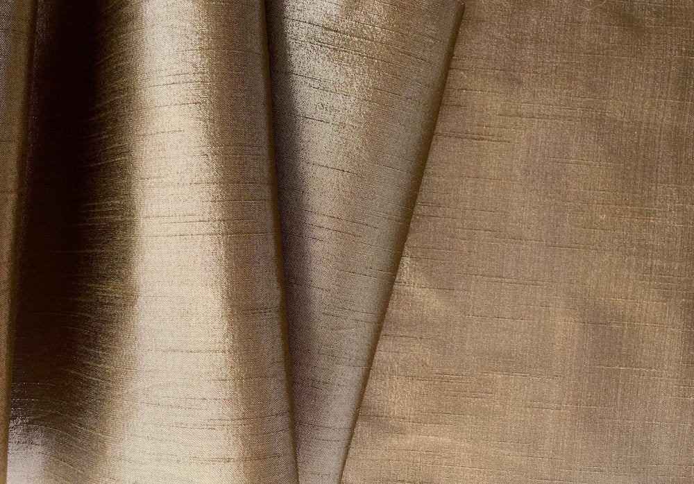 A crisp polyester dupioni in metallic antique bronze - this slubbed and subtle dupioni is perfect for structured garments including party frocks, jackets, skirts, costumes, home decorating, and tops. 100% polyester. 54" wide.
