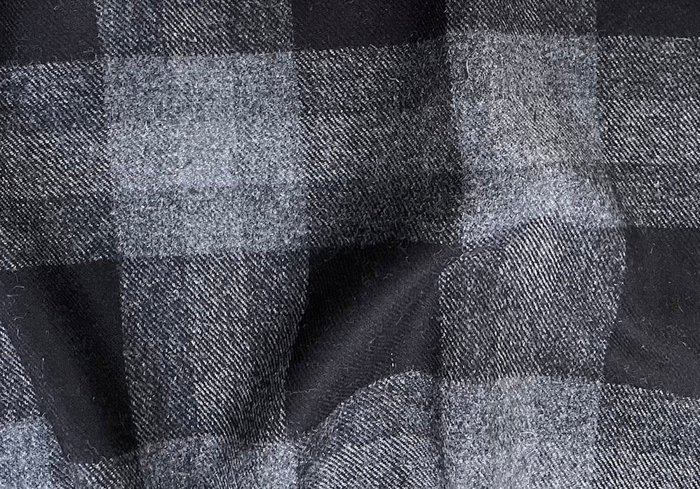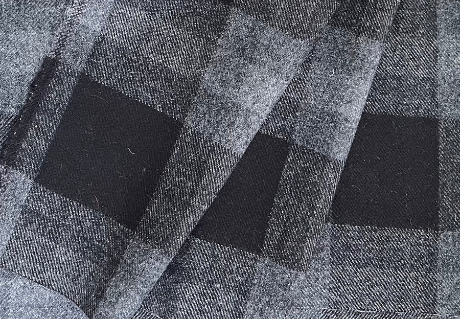 A mid-weight wool flannel in a whale grey, black, and smoke grey 2" plaid - this softly brushed wool is perfect for all types of tailoring projects from pleated skirts, to tailored jackets, to wide-legged pants. 100% wool. 60" wide.