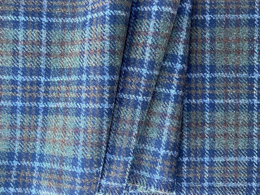 A high-end, mid-weight wool in shades of admiral blue, mossy olive, baby blue, and mouse - this soft and smooth woolen is perfect for tailored garments, overalls, jumpsuits, and handsome sport jackets. Made in Italy. 100% wool. 60" wide.
