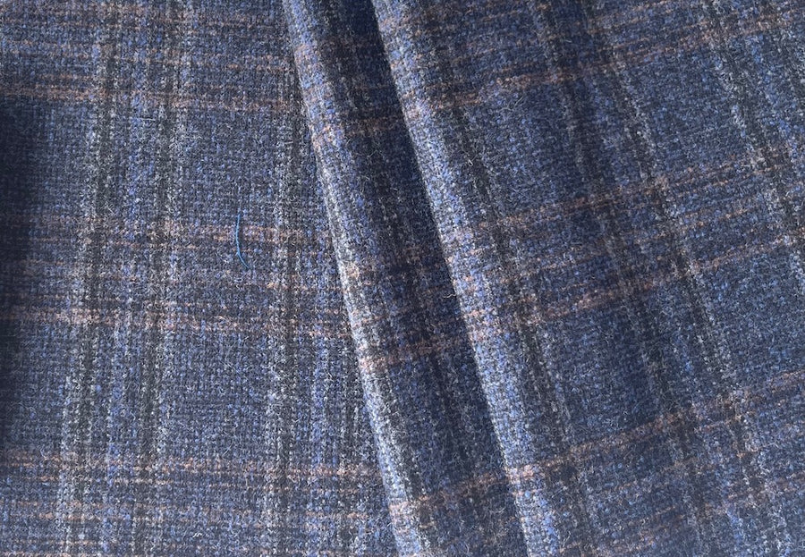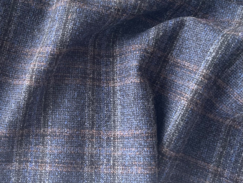 A drapey wool in a periwinkle, pearl grey, and black plaid, with hints of rust - with its beautiful coloration, this soft woolen is perfect for shirts, sheath dresses, or even culottes. Made in Italy. 100% wool. 60" wide.