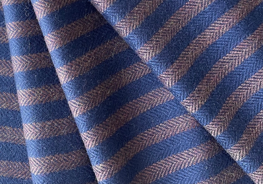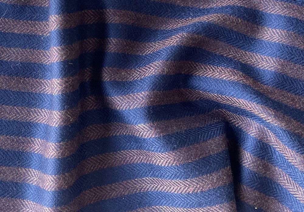 A fine light-weight wool and cashmere blend in bright navy and redwood brown crosswise 1/2" wide stripes - this deliciously airy wool is perfect for a luxurious scarf, a throw, a skirt, or a fitted sheath dress. Wool and cashmere blend. 62" wide.