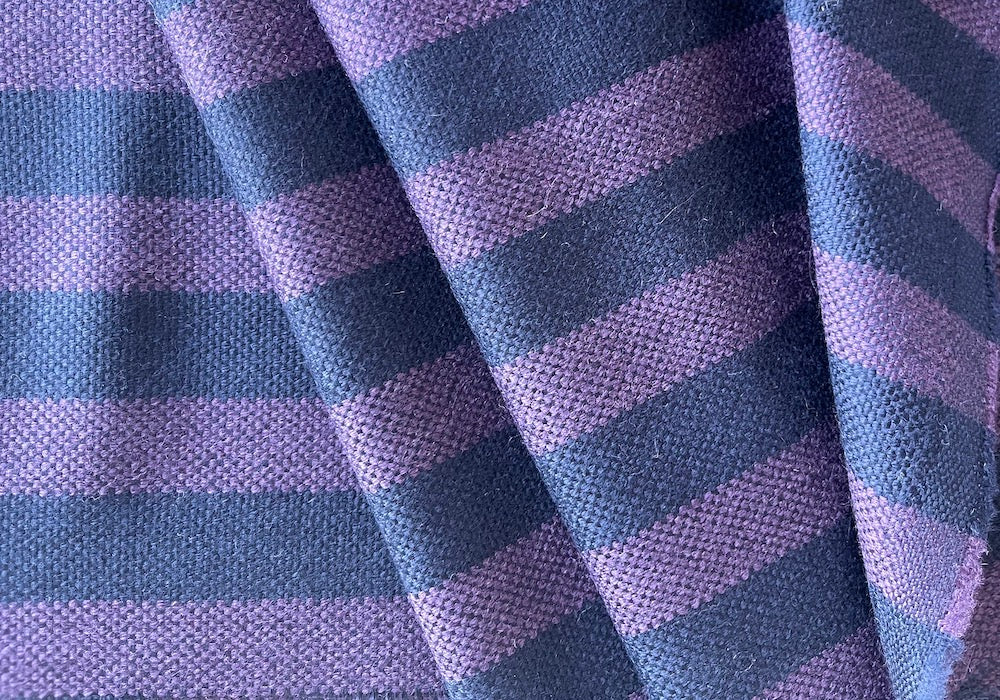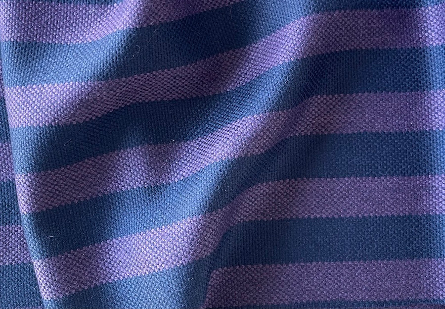 A fine, soft wool and cashmere in jaunty plum and navy horizontal stripes - this soft and smooth wool is perfect for scarves, throws, and skirts. Made in Australia. Wool and cashmere blend. 62" wide.