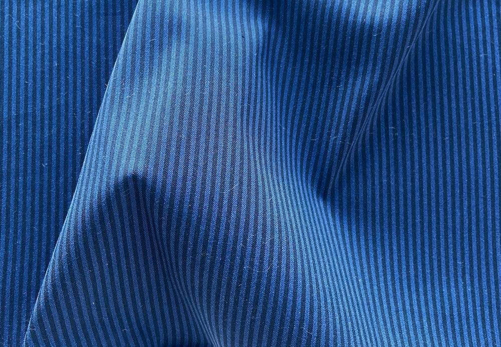 A stretch cotton poplin shirting in a narrow lengthwise navy and black stripe - with a touch of lycra, this sophisticated cotton is perfect for bespoke shirts, dresses, or slacks. Made in Italy. 77% cotton, 20% nylon, and 3% lycra. 58" wide.