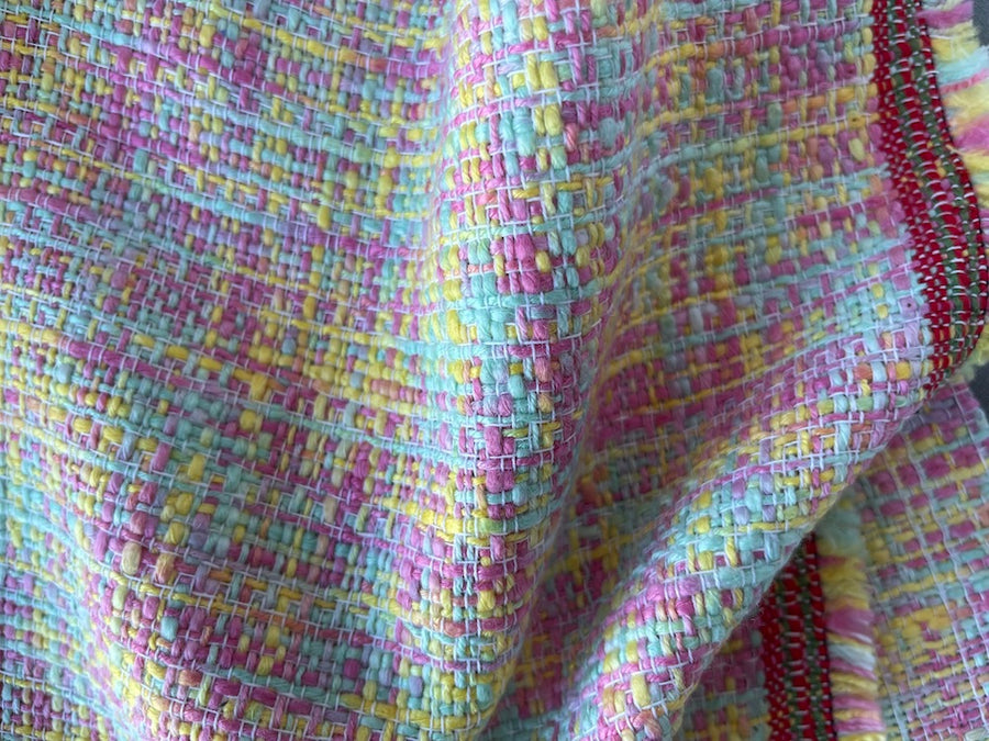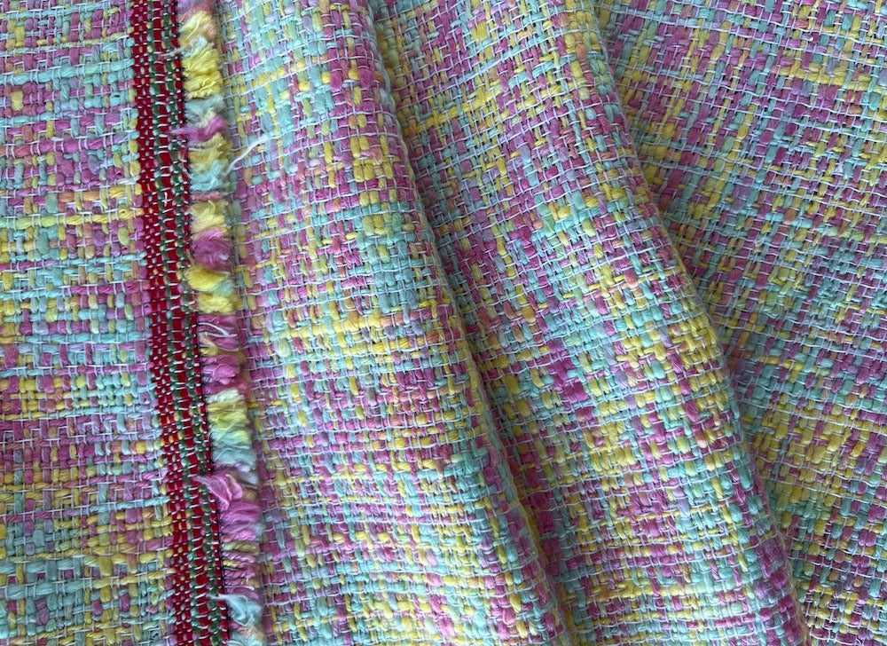 A light to mid-weight cotton blend tweed suiting in spirited pastel "fruit loop" colors of pink, yellow, mint, sky blue, and white - perfect for a sheath dress, a skirt, a tunic top, or a warm weather jacket. Cotton and polyester blend. 56" wide.